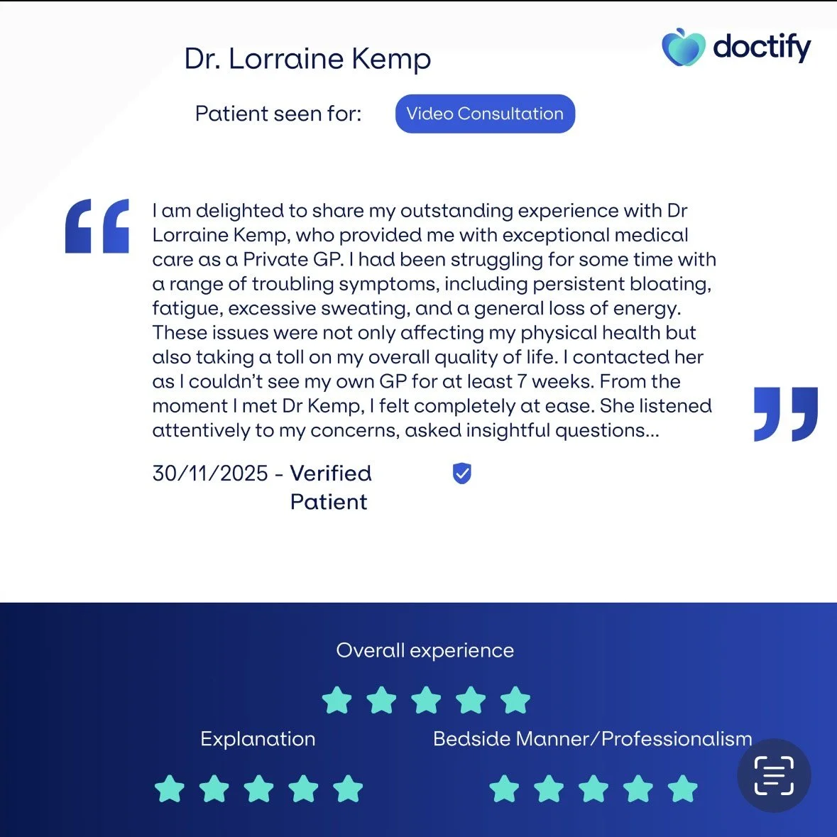The fee includes: referral letters, issuing of private prescriptions, fit notes & a summary for you & your GP.