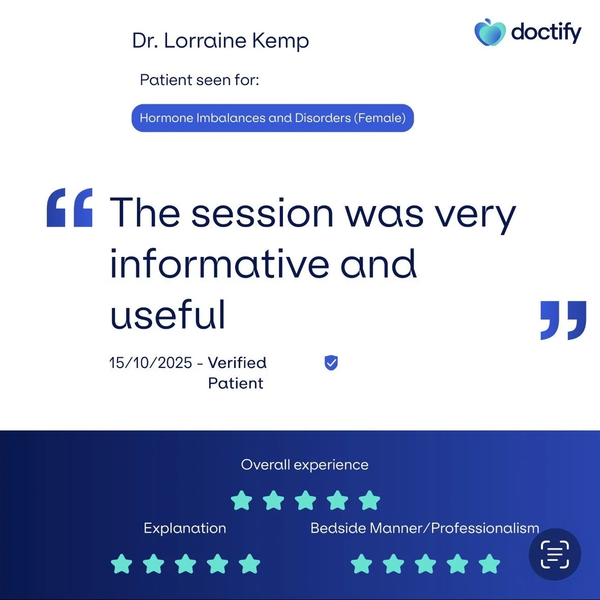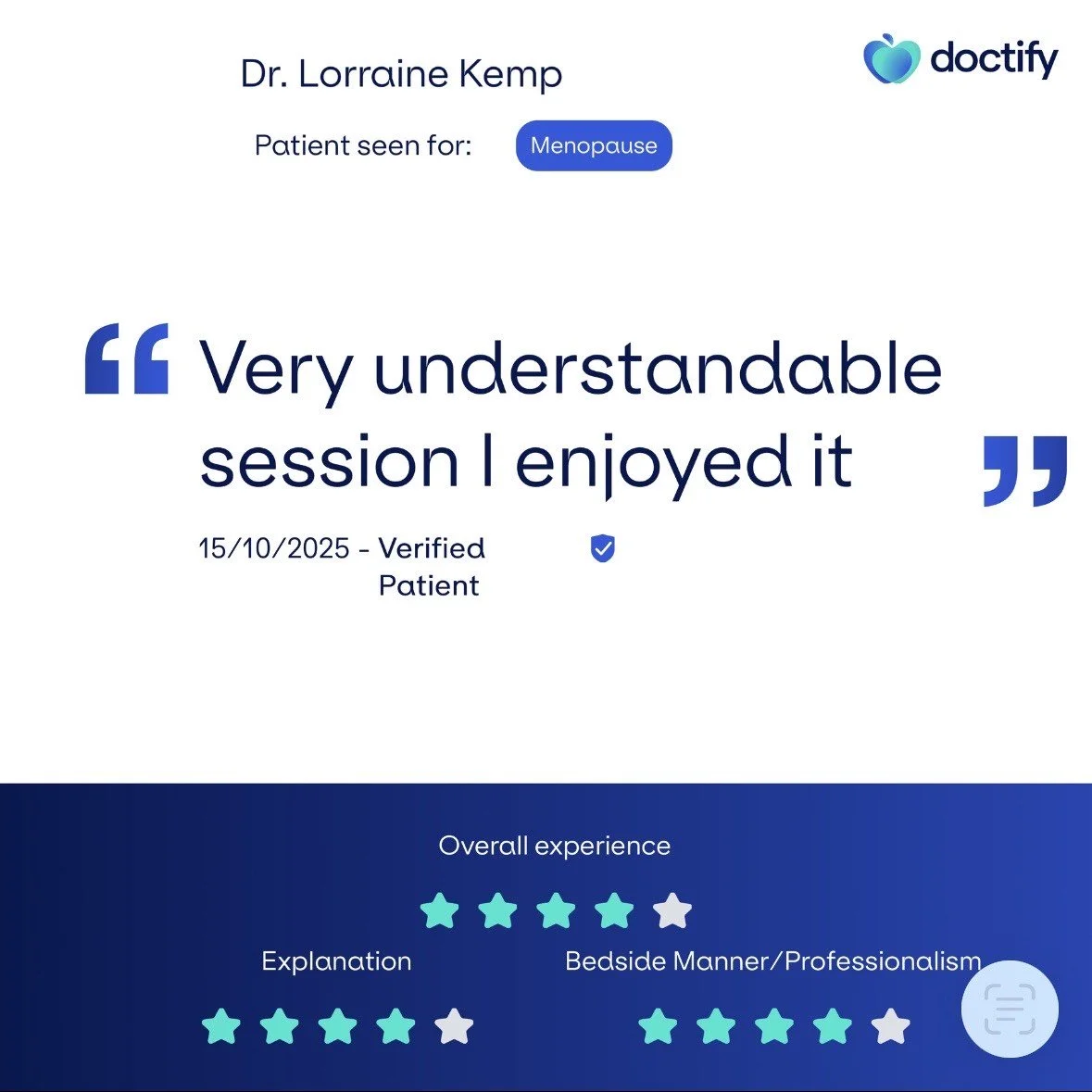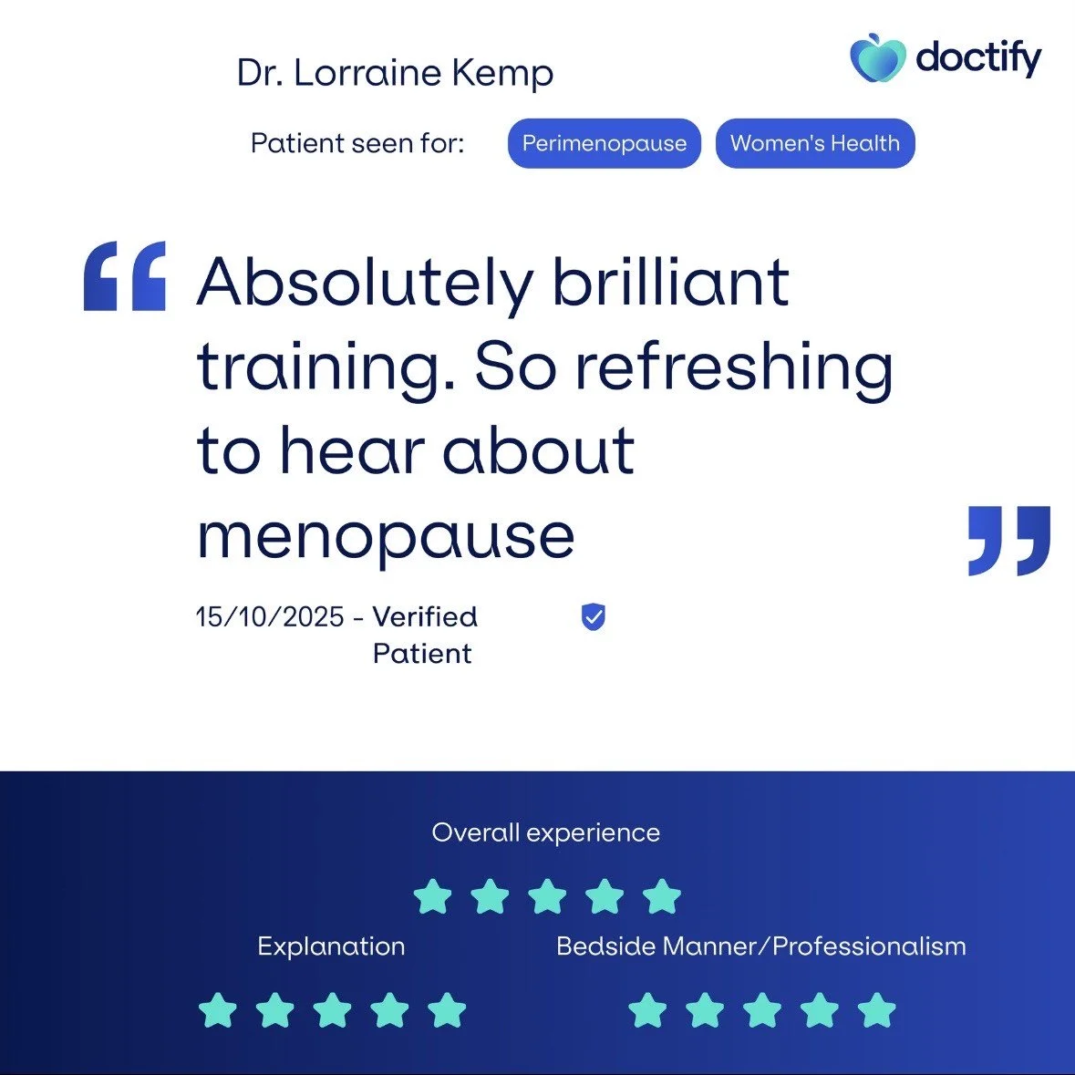 Dr Lorraine Kemp is experienced with group consultations & can consult your employees in a group of up to six patients. This is a novel option which gives the women individual & personalised treatment plan within a group setting. This enables women to have the shared experience & is supportive, fun & informative, as well as having an expert review of their symptoms and current treatment. They essentially listen into each others’ consultations & so learn even more about menopause care. This includes letters to the patients for their GP with a proposed treatment plan, an issue of private prescriptions, & any private specialist referral letters. The participants will need to sign a confidentiality agreement in advance, plus the registration form & menopause questionnaire as they would for an initial menopause consultation.
